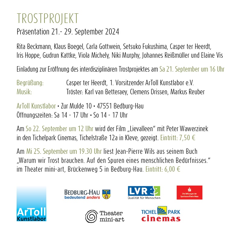 With a tabula rasa, a clean slate, the Trost project in ArToll started on September 7. Since then we have been working ‘vor Ort’ with 11 artists, looking for the meaning that consolation can have in visual art. Has it become a dusty theme, or is it more topical than ever? Participating artists are Rita Beckmann, Klaus Boegel, Carla Gottwein, Setsuko Fukushima, Iris Hoppe, Gudrun Kattke, Viola Michely, Niki Murphy, Johannes Reßmüller, Elaine Vis. I am participating in this project as artist too.